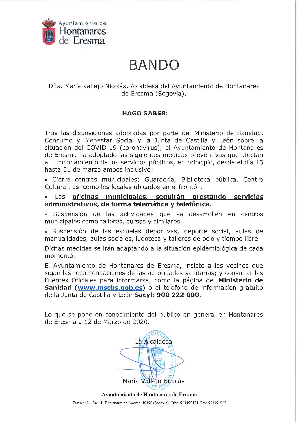 Tras las disposiciones adoptadas por parte del Ministerio de Sanidad, Consumo y Bienestar Social y la Junta de Castilla y León sobre la situación del COVID-19 (coronavirus), el Ayuntamiento de Hontanares de Eresma ha adoptado las siguientes medidas preventivas que afectan al funcionamiento de los servicios públicos, en principio, desde el día 13 hasta 31 de marzo ambos inclusive: