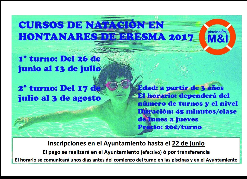 Haga click en la imagen para ver toda la información referente a los Cursos de Natación que se impartirán en la Piscina Municipal de Hontanares de Eresma durante el verano de 2017. INSCRIPCIONES EN EL AYUNTAMIENTO HASTA EL 22 DE JUNIO. Habrá un primer turno del 26 de junio al 13 de julio y el segundo será del 17 de julio al 3 de septiembre.