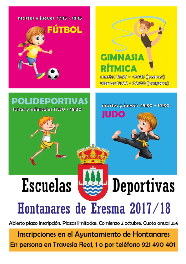 Más información sobre las Escuelas Deportivas de este curso. Ya está abierto el plazo de inscripción. Recordad que son sólo 25 € de cuota por curso. Las plazas son limitadas, no os despistéis. Se puede inscribir a los niños en el Ayuntamiento, bien en persona o por teléfono ( 921 49 04 01). Los horarios están en el cartel (hacer click en la imagen para ampliar) y SE EMPIEZA EL 2 DE OCTUBRE.